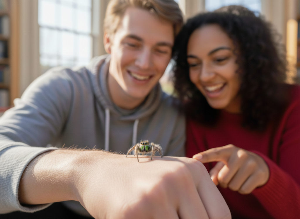 Where silk meets skin, Jumping Spiders and Humans weave their quiet companionship.